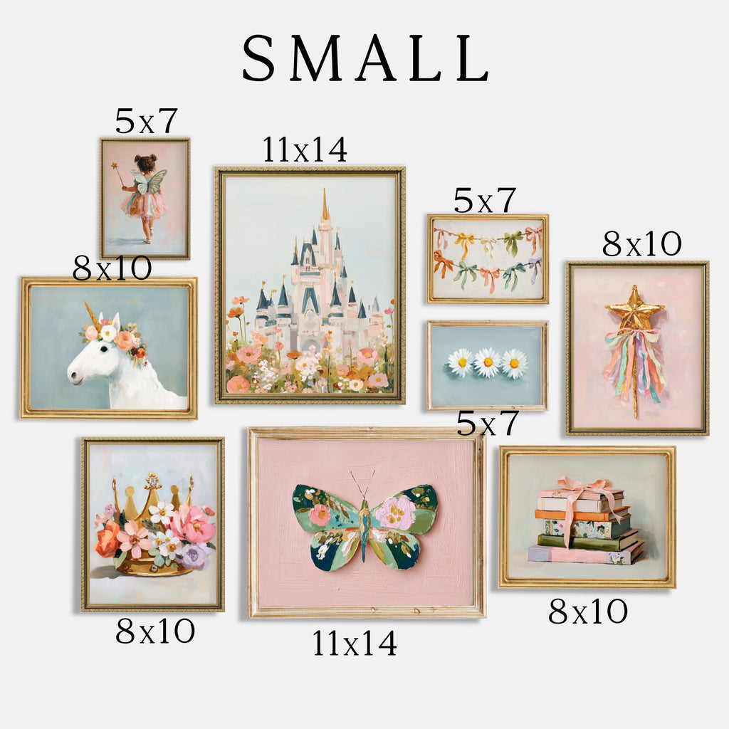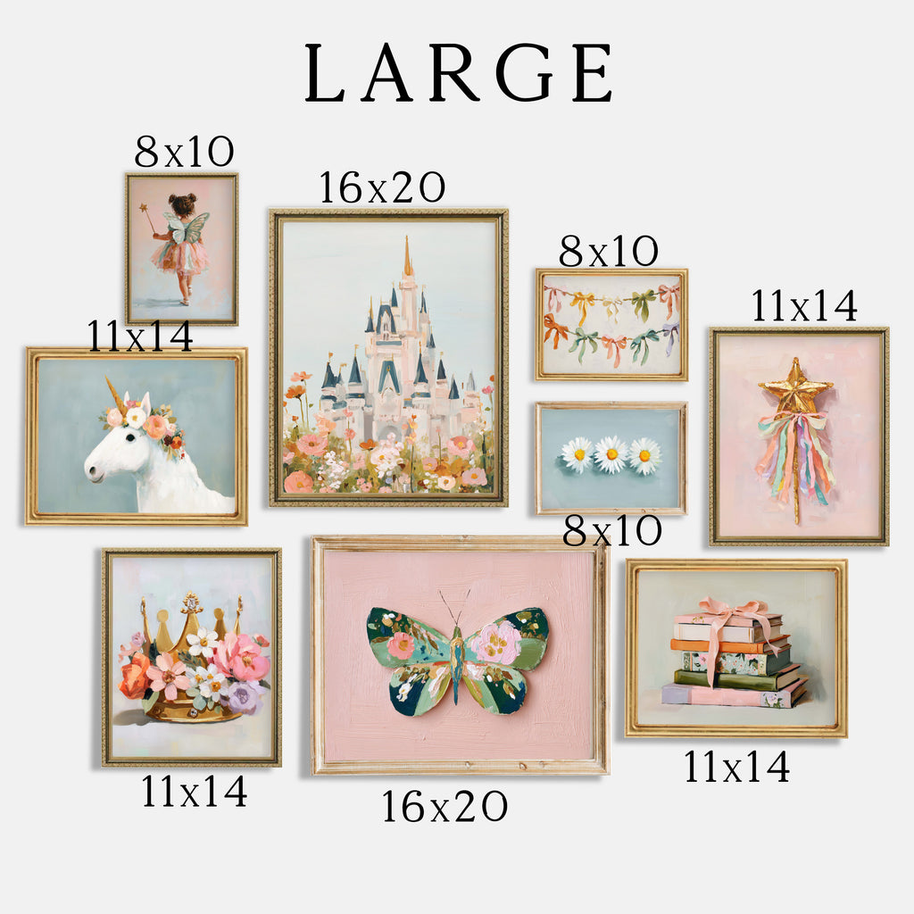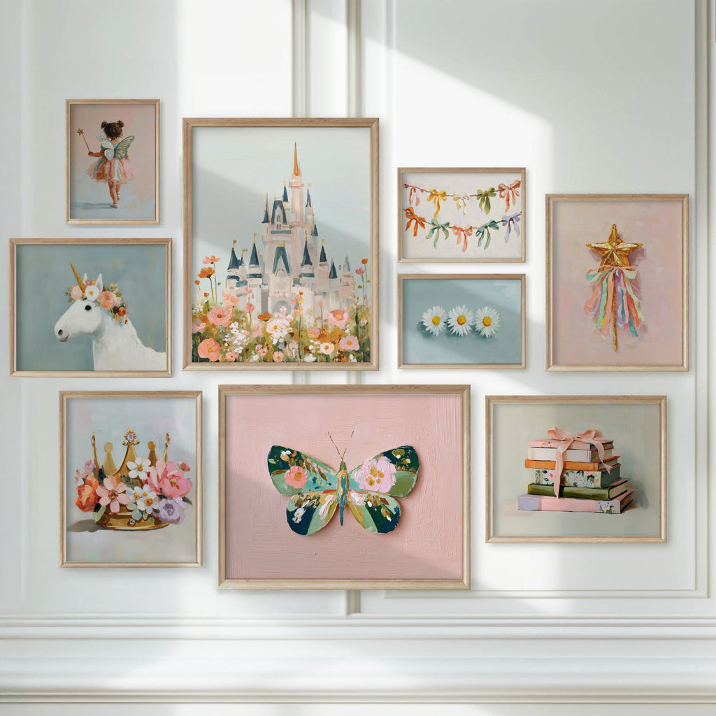 This beautiful set of 9 art prints feature various magical designs. Frames not included.
