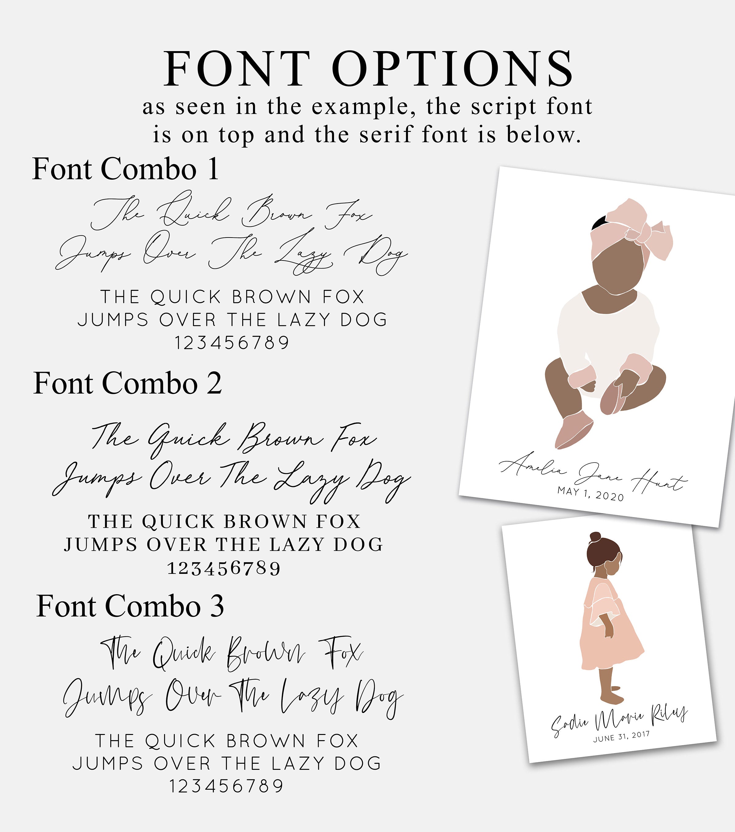 Please note that the photo on the main image is the style of print you will be receiving. Skin color, hair color, script text and serif text are customized based on your options placed in the customization boxes. Please do not leave any boxes blank.