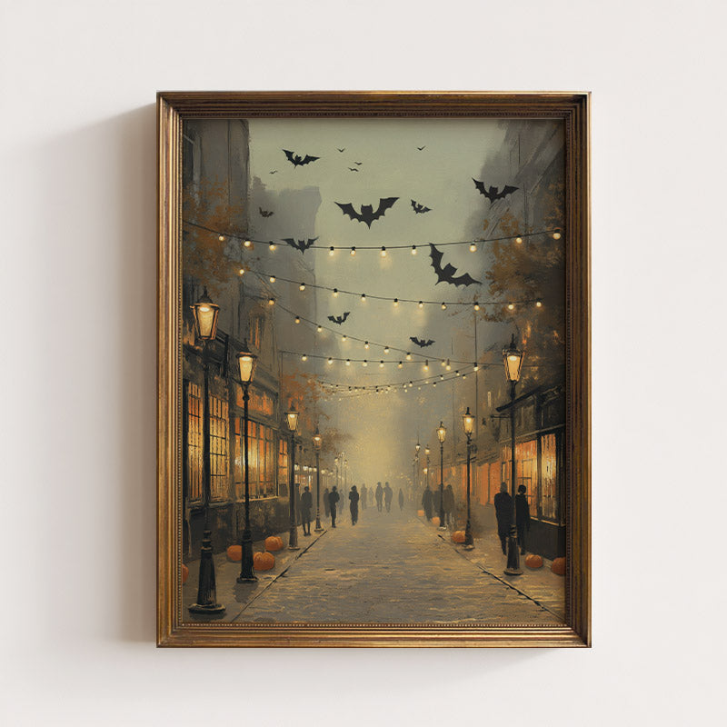This beautiful art print features a cobblestone street with bats flying overhead. Frame not included.