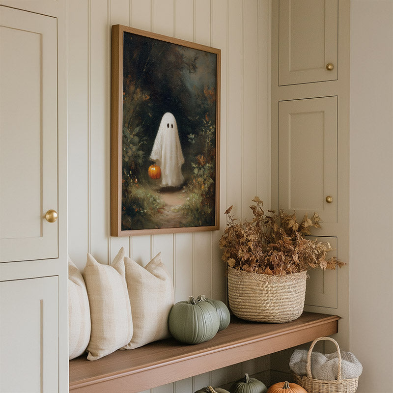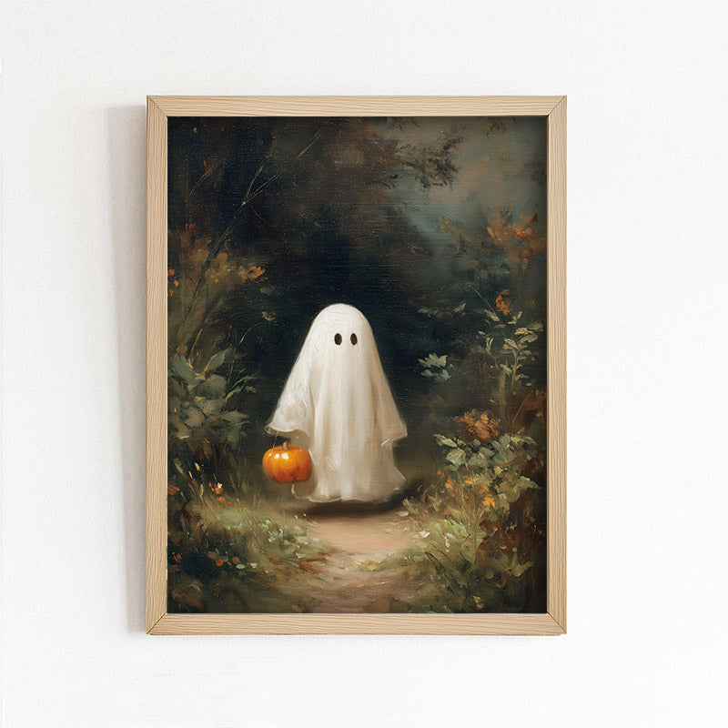 This beautiful art print features a cute ghost strolling through a forest. Frame not included.