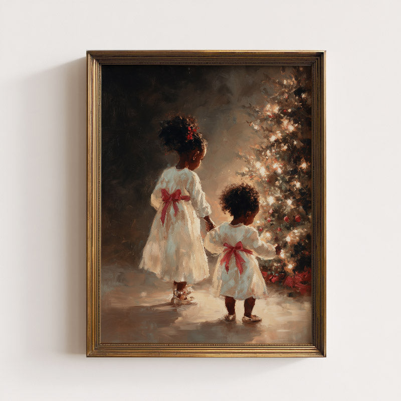 This beautiful art print features two sisters next to a Christmas tree. Frame not included.